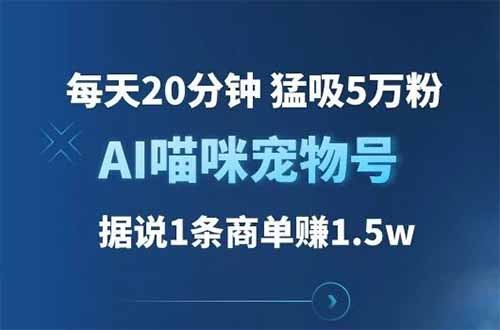 AI喵咪宠物号,每天20分钟 猛吸5万粉,1条商单赚1.5w