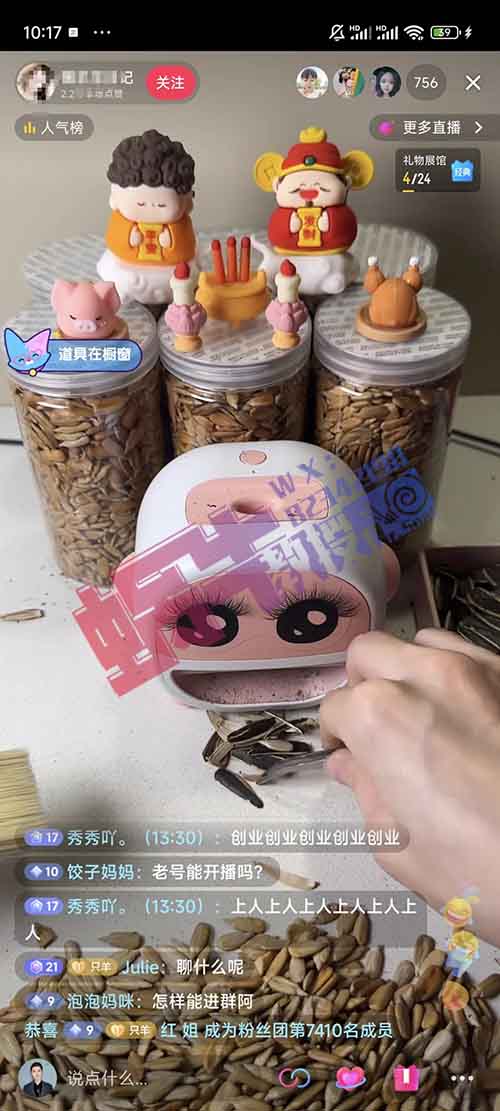 一个用自动剥瓜子工具在剥瓜子的直播间,