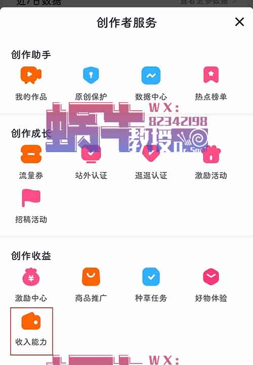 再点开常用服务,在“创作收益”栏中找到“收入能力”,开通商业化收入能力,这样你发视频就可以有对应的收益了。