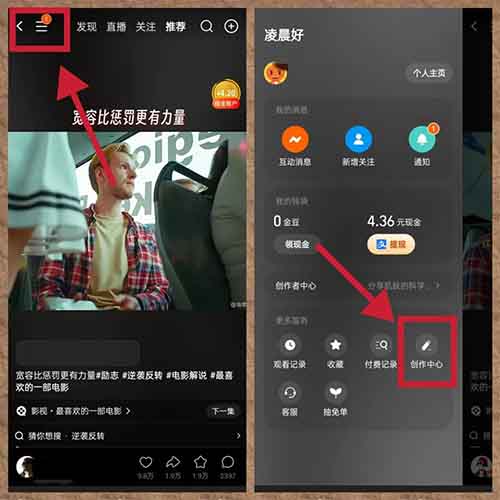 打开淘宝,点击下方的视频,然后点击右上角的三条杠,进入个人主页后,点击创作中心,如下图。