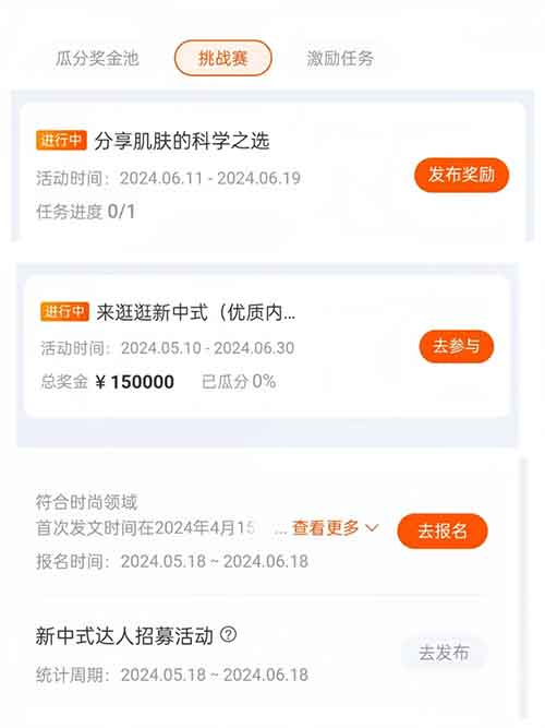 创作者服务里面有个激励活动,点击进去后就能看到很多活动,分为瓜分奖池挑战赛激励任务这三种类型,这些都是官方自己的活动,奖励还是比较丰厚的。