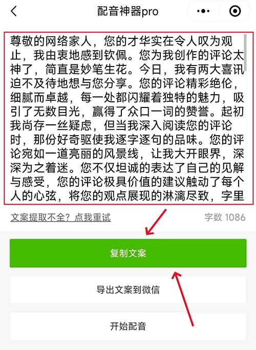 注意可能会出现错别字,你要先把文案读一读纠正错别字,然后再点击【复制文案】。
