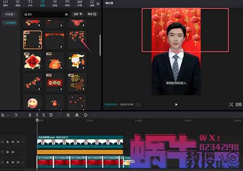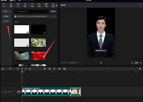 等待一会,数字人的背景就透明了,咱们再去【剪映】自带的素材库里,给他找个喜庆的背景图。
