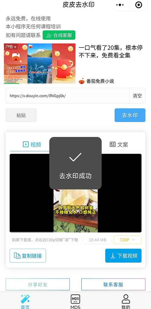 大家可以直接去抖音,搜索对应商品的名称,然后复制下链接,去【皮皮去水印】小程序,把带货视频解析下载下来。