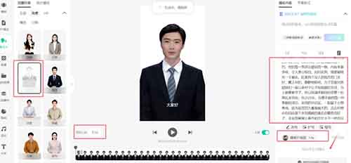 在左侧【预置形象】里,选择一个免费的数字人形象。中间的画布比例,选择【9:16】,把数字人拖动调整大小,并且在右侧文本框里,输入你的文案,配音用【康哥】的就行,再点击【保存并生成播报】。