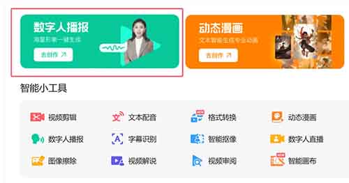 打开咱们生成【数字人】视频的工具网站,找到【数字人播报功能】,点进去。