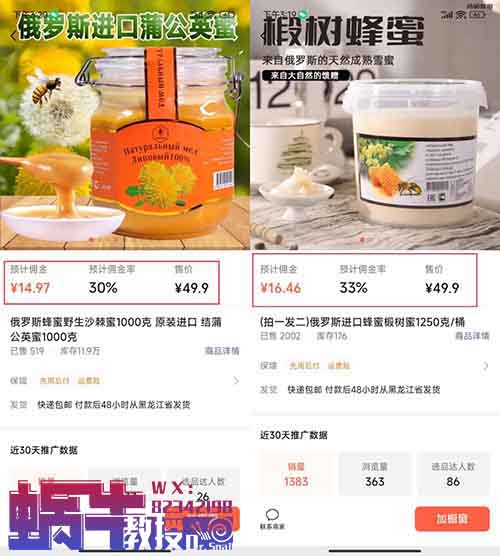 我去看了看他卖的最好的两个品,都是俄罗斯进口蜂蜜,49.9元的价格,佣金30%~40%,出一单能挣个14~16元左右,排除掉其他一些高利润产品,那2000单的利润大概是3万元。