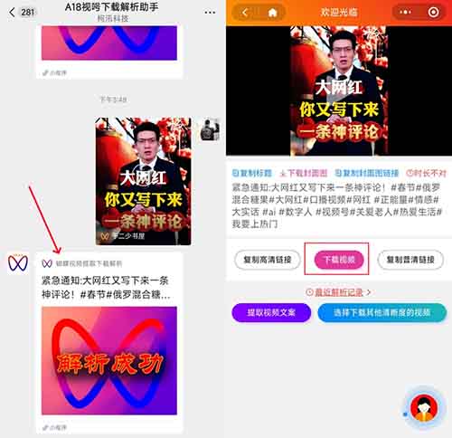提取视频文案的方法是,把对标视频的转发给小程序【A18视呺下载解析助手】,这个是我在网上搜到的小程序,用来解析下载视频号上的视频的,免费的,比较好用。