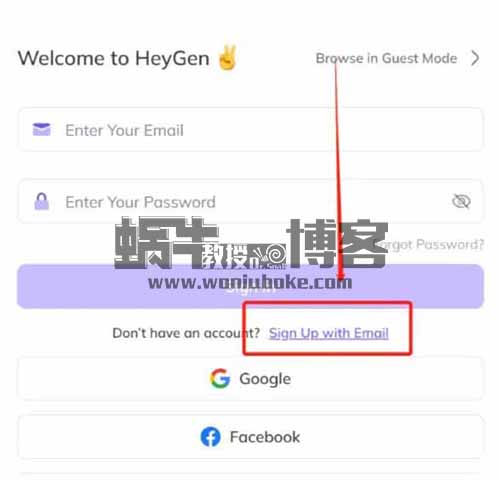有了这个临时邮箱之后,我们再来到heygen上面,打开heygen的主页,然后在下面有一个注册的入口,点注册能把我们刚才获取到的这个邮箱填进去。