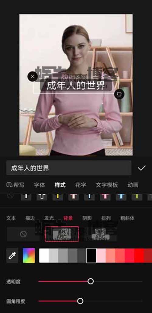 截图完了之后,把这个截图找到剪映里面裁剪适合的区域,点文字,新建文字,在文字的样式里面找到背景,选择透明度50,这样就出现了一个半透明的黑色的区域。
