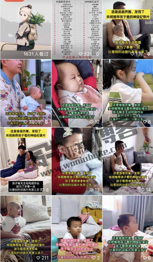 每个视频的开头,都是大人抱着孩子或者萌娃自己在全神贯注的看一个东西的状态,然后镜头一转,原来看的是纪录片。