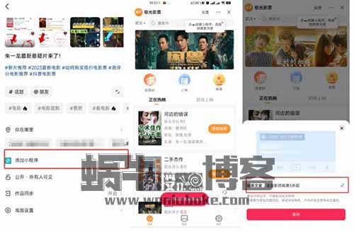 4)添加小程序。在发布页面选择“添加小程序”,选择“极光影票”,在说明文案这里,记得要修改后面的默认文案,比如改为:“特惠购票入口”等文案。这样用户在哪里下单就一目了然了。