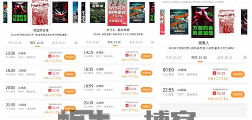 2)在极光小程序中,找一些价格比较低的电影院的电影,比如19.9元的电影票,截图保存下来。(如果实在找不到,可以将城市改为“深圳--宝影国际影城”,电影票比较便宜)
