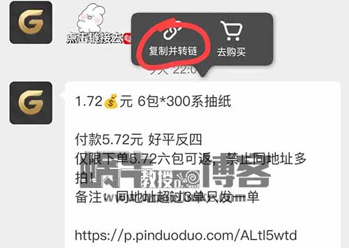 长按群组中的链接,点击标记点即可将其转化为自己的链接,同时复制文案。可以将链接和文案发布到朋友圈或微信上,当别人下单时,同时也会获得对应的收益。