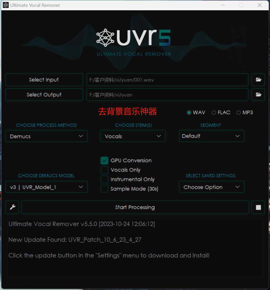 干净的意思就是只有一个人的声音+没有背景音色+一些杂音,推荐处理软件Audition,Ultimate Vocal Remover(通用软件链接我放在文章的底部,所有软件都是绝对免费的,自行下载即可),导出为wav格式的音频,格式不能弄错,必须是wav格式。