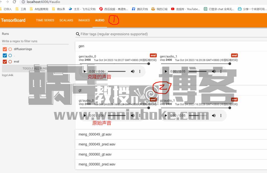 点击.so-vits-svc启动tensorboard.bat,拷贝http://localhost冒号6006 到谷歌浏览器中打开,点击页码标签【AUDIO】,试听克隆语音是否相似,如果满意就可以停止训练了
