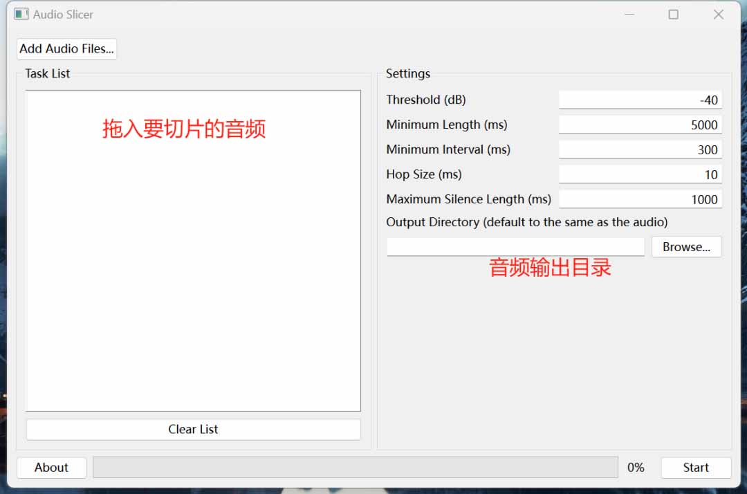 2、声音切片,把大段音频切成15秒左右的音频切片,用的软件是Audio Slicer,一键切片