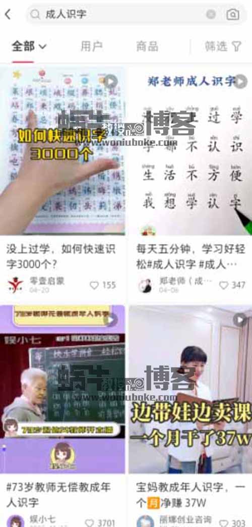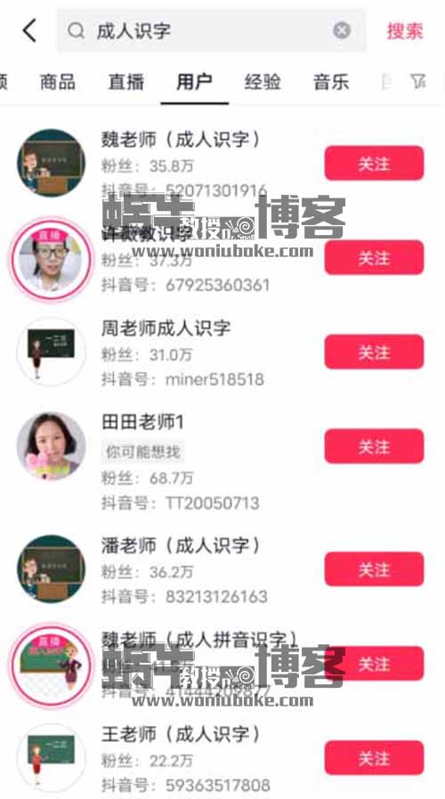 我妈就是不认字,但我也从未想到过成识字这样的项目,这就是认知上的不足。随后,我通过搜索,找出了很多有关成人识字的账号,没想到的是,排名前面的账号,粉丝数量都在几十万左右。