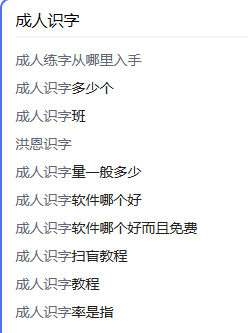 我有个习惯,就是在验证一个项目的时候,习惯性的都去各大平台搜索一下,比如百度,输入关键词“成人识字”,下拉框给我了很多的需求灵感。