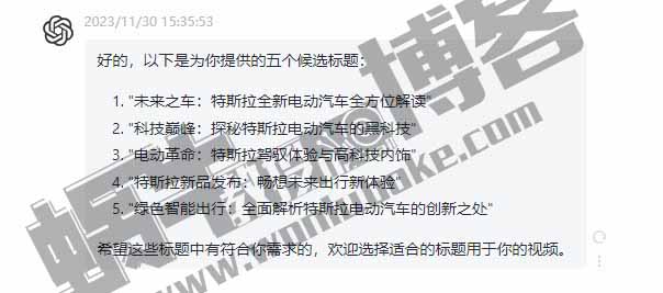 很多人把生成好的视频传平台都有一个这样的小纠结,那就是不知道怎么给视频取个好点的标题,其实非常好解决的,把文案脚本放到GPT里,叫GPT生成五个候选标题供我们选择即可,我们挑选更符合我们视频主题的标题就行了,全程不需要自己动脑筋去想的,非常简单好操作。