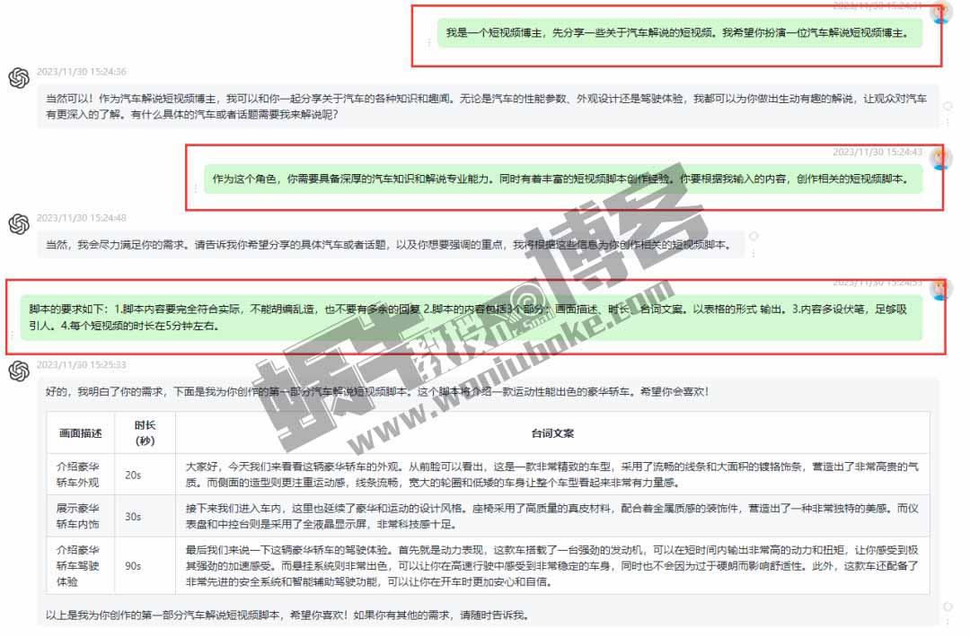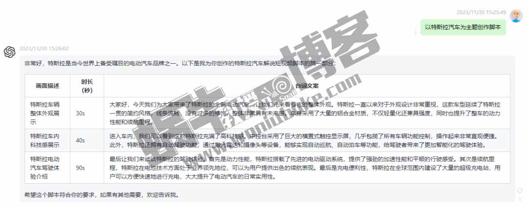 大家可以参考下,红色区域就是我调教GPT的话术,调教结束后,我们就可以直接输入标题,AI就能生成更加符合我们需求的短视频脚本文案了,比如我直接输入“以特斯拉汽车为主题创作脚本”这样的对话,就生成了相对应的脚本文案。