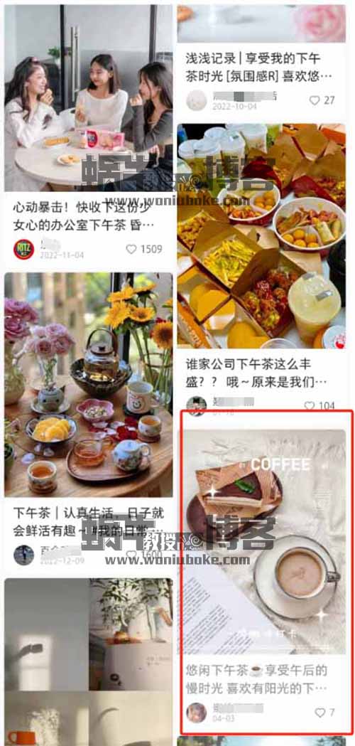 3、根据文案内容去小红书找对应的图片。比如我搜索的是“下午茶时光”,在结果页找符合AI生成文案的图片;