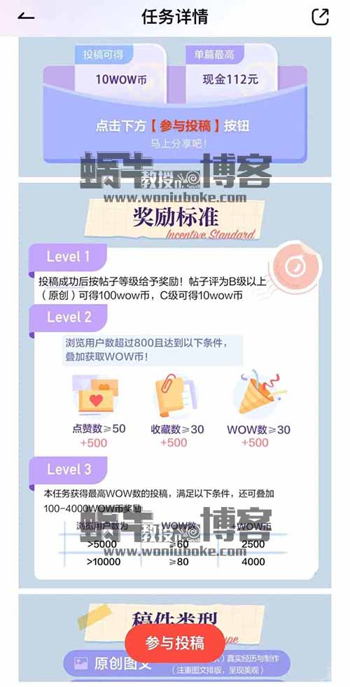 发布一个作品,通过审核能有10个WOW币保底,播放量超过800,点赞50个额外获得500个WOW币,收藏30个额外再加500个WOW币。