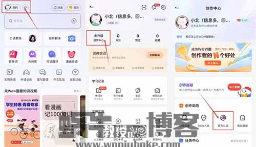 1、下载有道词典APP,注册并登录账号,点击左上角的头像,点击进入创作者中心,进行官方认证,成为社区的创作者。