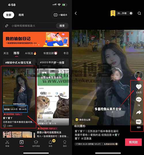 2、初期创作可以选择一些热门的素材,例如AI玩法、卡点玩法、情感玩法、风格大片等等;也可以参考目前抖音等平台的热点视频内容,进行总结。