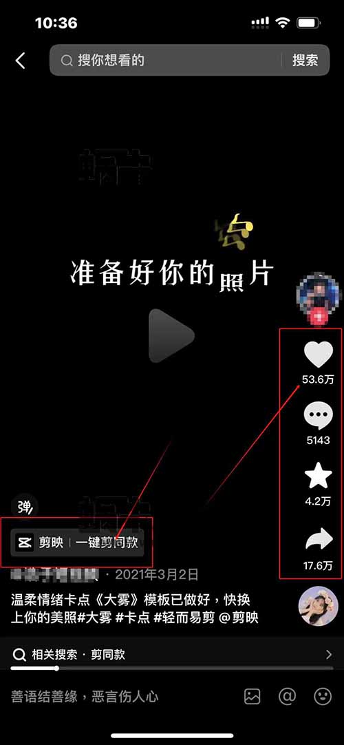 4、在抖音上做流量推广,使用制作好的模板在抖音发布作品的时候,附上制作的剪映模板的跳转链接,用户觉得模板不错,就可以直接点击链接进入剪映进行剪同款。