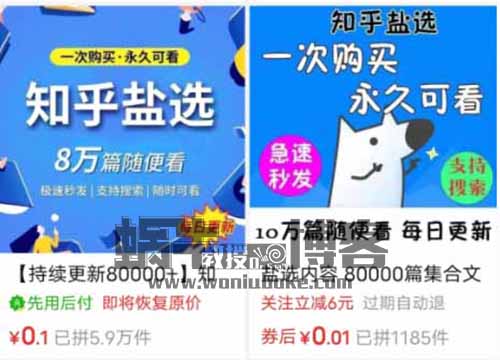 既然可以卖天涯的内容整理资料,那么,我们换个其他的平台,整理其他平台热门的内容行不行呢?肯定行,我在某多搜索了“知乎”,也有盐选内容出售。