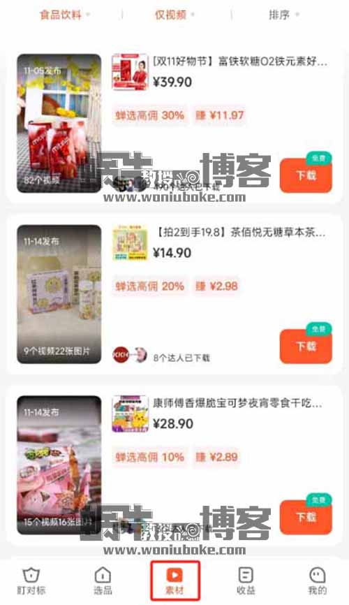 (2)素材下载:打开蝉选APP后,点击中间的“素材”选项,在商品类目中选择“食品饮料”,然后选择你打算推广的商品。点击“下载”,这里可以选择“图文素材”或“视频素材”,选择你需要的进行下载。