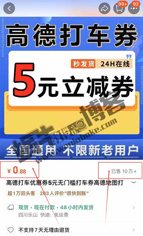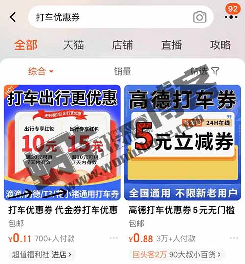 其次,可以在一些电商平台,例如拼多多、淘宝等等,搜索“打车优惠券”,会出现很多商品链接,选择一个优惠的进行下单,下单之后商家会发送给你一个优惠券网址,你需要输入手机号码即可领取,且这个网址是可以循环使用的。