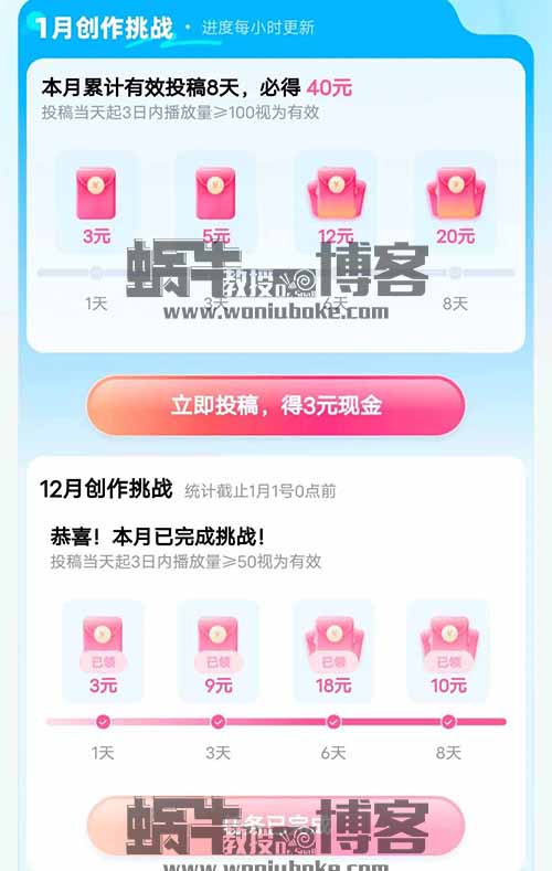 每个月发布8天的作品就能领到40元,我在去年12月已经领到了,目前1月份的作品还未开始发布。发布视频的类型没有限制,只要不违规,播放量大于50就算投稿成功。