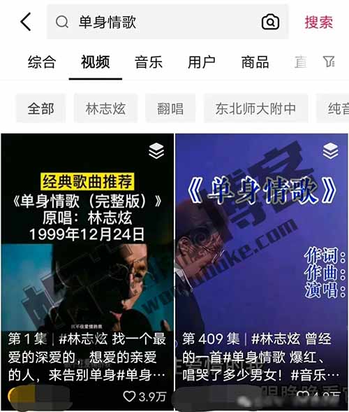 如果你打算使用歌手视频,以林志炫的《单身情歌》为例,可以在抖音上搜索该歌曲,你会看到许多相关的演唱会视频。