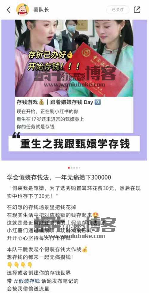 最近蜗牛教授发现有个小红书的玩法很不错,不仅很容易吸引用户点赞评论,而且还可以根据自己的兴趣去做笔记内容。更重要的是,这个玩法只需要做图文笔记就可以了,就是--假装存钱的玩法。