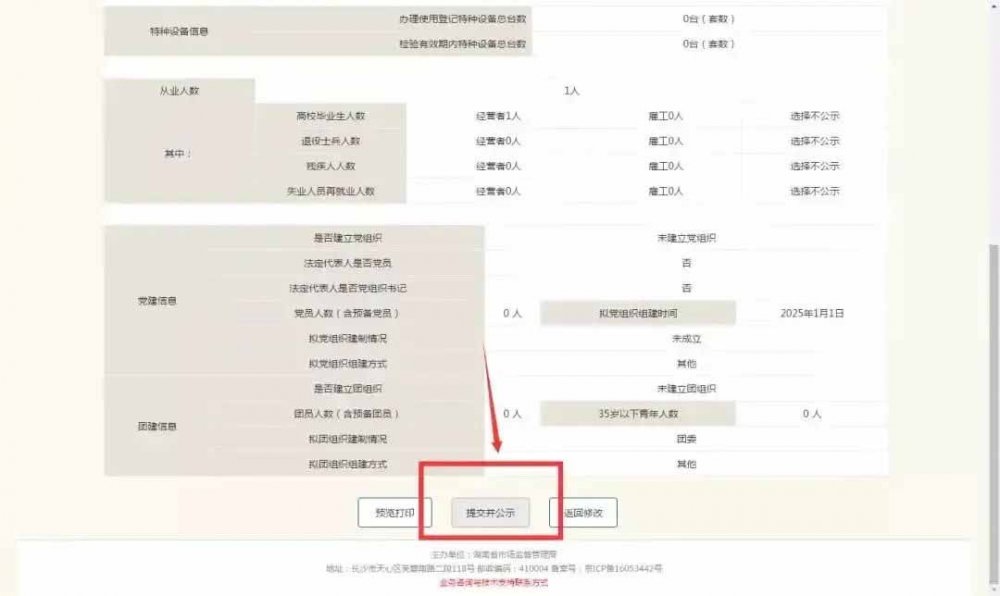 填写无误直接点击下方“提交并公示”;如果需要修改点击“返回修改”,修改完成后再点击“预览”,确保正确后点击“提交并公示”。