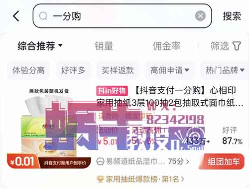 3、在主页进入抖音商城,搜索“一分购”,会显示出很多可以推广分佣的产品信息。
