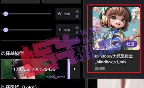 接下来,在基模型选项中选择「blindbox/大概是盲盒」,然后在LoRA风格中选择“其他风格”,并从列表中选择你刚创建的模型。
