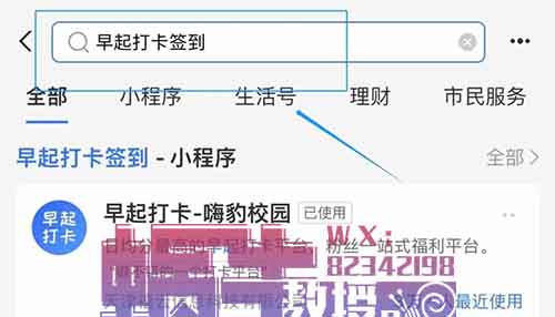 登录后,在首页的搜索框里搜索“早起打卡”小程序,如下图。