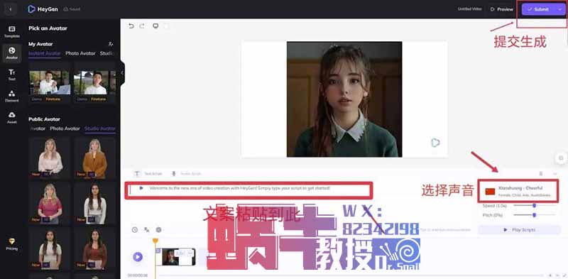 画布尺寸调整到原始大小后,选择创建视频,把我们选择好晨读文案粘贴上去,并选择好一个甜美的中国小女孩声音,最后提交生成好视频。