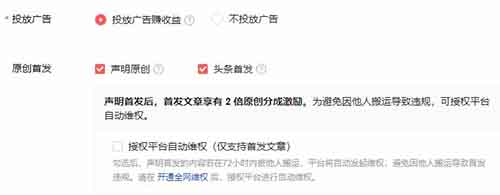 发布时一定要勾选“原创声明”,“头条首发”,“投放广告赚收益”这三个选项。