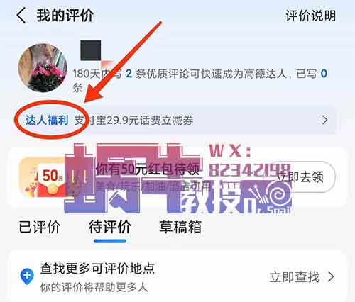 进入个人中心,点击“待评价”进入,在昵称下面有个“达人福利”。