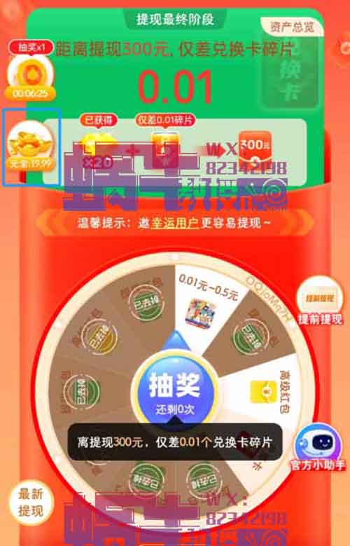 蜗牛教授自己也去试了下提现300,找了四五个好友助力,然后在闲鱼上下单了40人的好友助力,从0.01的红包、钻石、兑换卡,最后卡在了0.01的元宝这里,再怎么助力,也只能抽到锦鲤附体。
