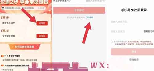 绑定:进入拼多多首页-点击多多视频-个人中心-带货-进行多多进宝的绑定;一定要进行这步操作,不绑定佣金到不了账。
