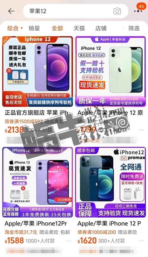 然后打开咱们的淘宝直接搜:苹果XR,苹果11,12这些机型是目前有猫腻最多的机型!咱们本期就拿苹果12为例 ,现在正常价格是在1700-2200之间!