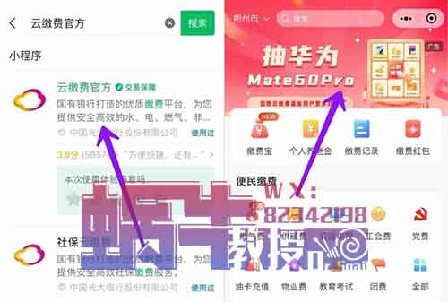 小程序搜索【云缴费官方】,进入小程序,在顶部找到抽华为活动。