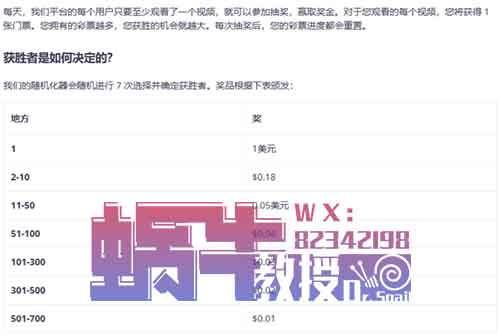 平台会根据你每天观看的视频数量给你发放抽奖票,看的越多抽奖票就越多,中奖概率也就越大,中奖金额在0.01-1美金。