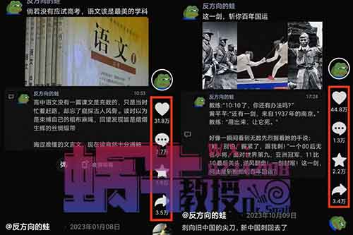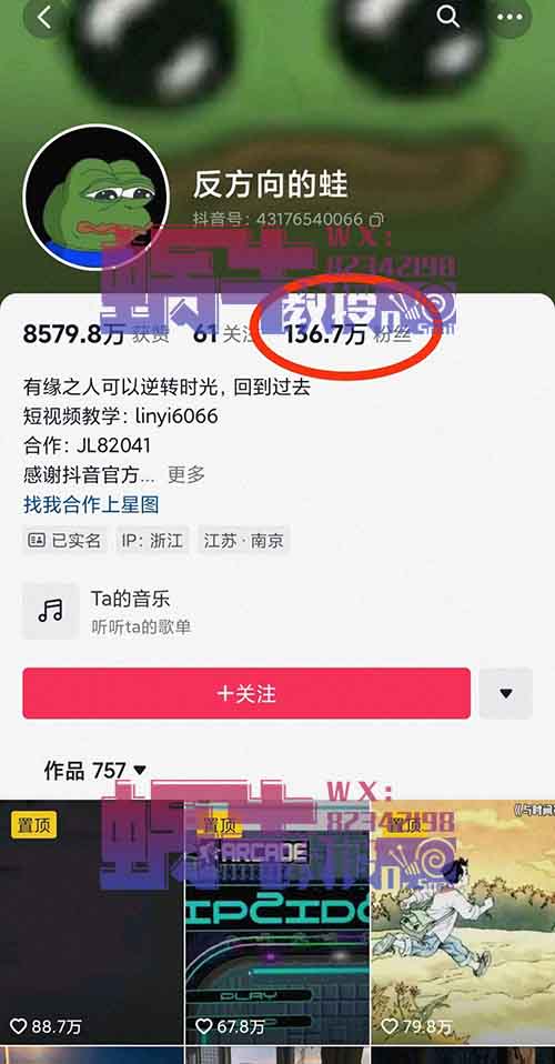 大家在抖音搜索"反方向的蛙“,这个账号有136.6万粉丝,单个作品的点赞量都非常高,数据非常亮眼。