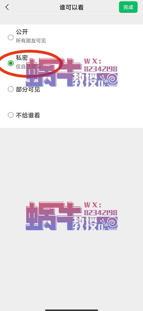 先发布一条朋友配图朋友圈,发布时在“谁可以看”里,选择“私密/仅自己可见”。